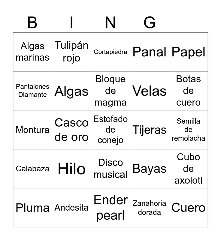 This bingo card has 44 words: Manzana de oro, Hilo, Pez globo, Zanahoria dorada, Tinte verde lima, Ballesta, Algas, Esmeralda, Panal, Cuero, Algas marinas, Andesita, Bayas, Semilla de remolacha, Espada de oro, Huevo, Estofado de conejo, Tijeras, Patata venenosa, Montura, Tulipán rojo, Disco musical, Girasol, Papel, orquidea azul, Flor lila, Bloque de magma, Terracota, Cubo de axolotl, Pluma, Bloque de hielo, Cortapiedra, Altohorno, mesa de arquería, Calabaza, Sandia, Ender pearl, Caldero, Botas de cuero, Pantalones Diamante, Casco de oro, Pararayos, Velas and Cadenas.