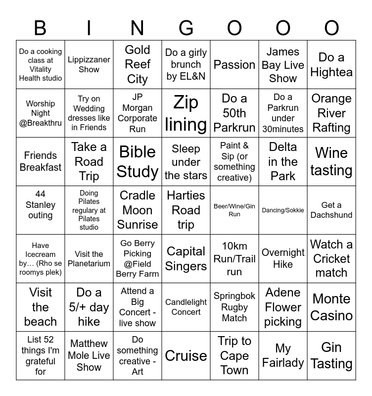 This bingo card has a free space and 55 words: Trip to Cape Town, Wine tasting, Skad Freefall @Soweto Towers, Do a cooking class at Vitality Health studio, Doing Pilates regulary at Pilates studio, Do a 5/+ day hike, Do a Hightea, Run a Half Marathon, Try on Wedding dresses like in Friends, Attend a Big Concert - live show, Do a girly brunch by EL&N, Watch a Cricket match, Get a Dachshund, Dancing/Sokkie, List 52 things I'm grateful for, Have Icecream by… (Rho se roomys plek), Passion, Do a 50th Parkrun, My Fairlady, Do a Parkrun under 30minutes, Orange River Rafting, Visit the Planetarium, Paint & Sip (or something creative), Gold Reef City, Drakenberge, Worship Night @Breakthru, Cradle Moon Sunrise, Friends Dinner, Friends Breakfast, Delta in the Park, Clay Café, Overnight Hike, Monte Casino, Matthew Mole Live Show, James Bay Live Show, Zip lining, Visit the beach, Take a Road Trip, Gin Tasting, Go Berry Picking @Field Berry Farm, Lippizzaner Show, Candlelight Concert, Springbok Rugby Match, Dance Classes, Bible Study, 44 Stanley outing, Do something creative - Art, 10km Run/Trail run, Beer/Wine/Gin Run, JP Morgan Corporate Run, Capital Singers, Adene Flower picking, Cruise, Sleep under the stars and Murder Mystery Party.