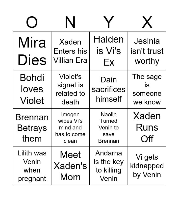 This bingo card has 16 words: Meet Xaden's Mom, Xaden Runs Off, Halden is Vi's Ex, Mira Dies, Brennan Betrays them, Xaden Enters his Villian Era, Naolin Turned Venin to save Brennan, Andarna is the key to killing Venin, Bohdi loves Violet, Violet's signet is related to death, Lilith was Venin when pregnant, Jesinia isn't trust worthy, Imogen wipes Vi's mind and has to come clean, The sage is someone we know, Dain sacrifices himself and Vi gets kidnapped by Venin.