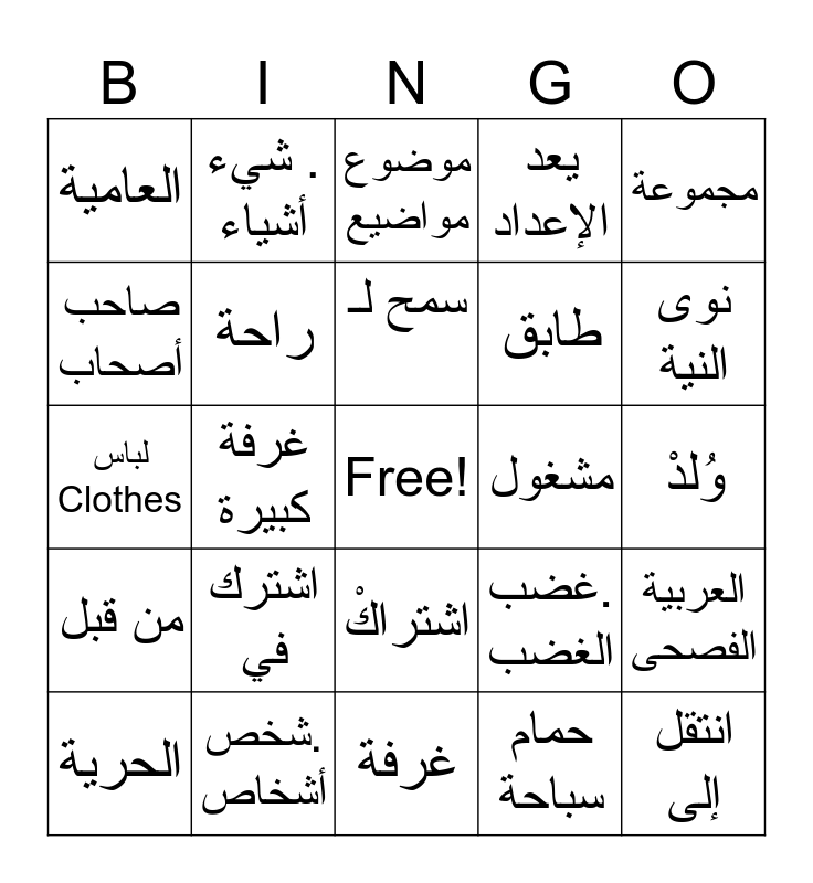 This bingo card has a free space and 24 words: اشترك في, شخص. أشخاص, سمح لـ, الحرية, مجموعة, العامية, صاحب أصحاب, شيء . أشياء, مشغول, اشتراكْ, طابق, لباس Clothes, غضب. الغضب, العربية الفصحى, راحة, حمام سباحة, وُلدْ, موضوع مواضيع, نوى النية, غرفة كبيرة, انتقل إلى, من قبل, يعد الإعداد and غرفة.