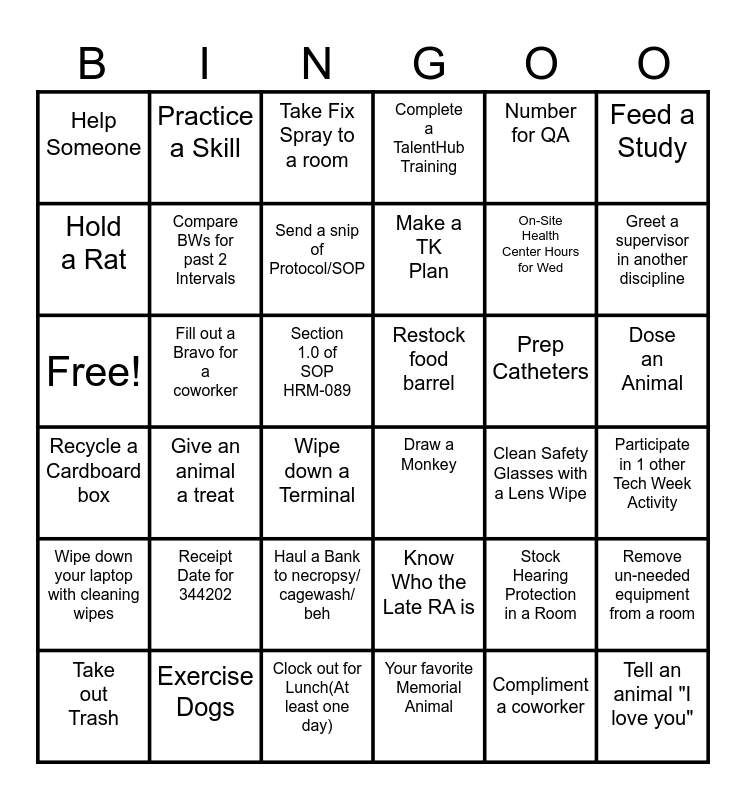 This bingo card has 36 words: Know Who the Late RA is, Haul a Bank to necropsy/ cagewash/ beh, Your favorite Memorial Animal, Hold a Rat, Recycle a Cardboard box, Restock food barrel, Compare BWs for past 2 Intervals, Clock out for Lunch(At least one day), Number for QA, Stock Hearing Protection in a Room, Greet a supervisor in another discipline, Complete a TalentHub Training, Remove un-needed equipment from a room, Fill out a Bravo for a coworker, Make a TK Plan, Help Someone, Wipe down your laptop with cleaning wipes, Prep Catheters, Free!, Take Fix Spray to a room, Section 1.0 of SOP HRM-089, Give an animal a treat, Draw a Monkey, Wipe down a Terminal, Clean Safety Glasses with a Lens Wipe, Practice a Skill, On-Site Health Center Hours for Wed, Exercise Dogs, Send a snip of Protocol/SOP, Feed a Study, Tell an animal "I love you", Take out Trash, Participate in 1 other Tech Week Activity, Dose an Animal, Receipt Date for 344202 and Compliment a coworker.