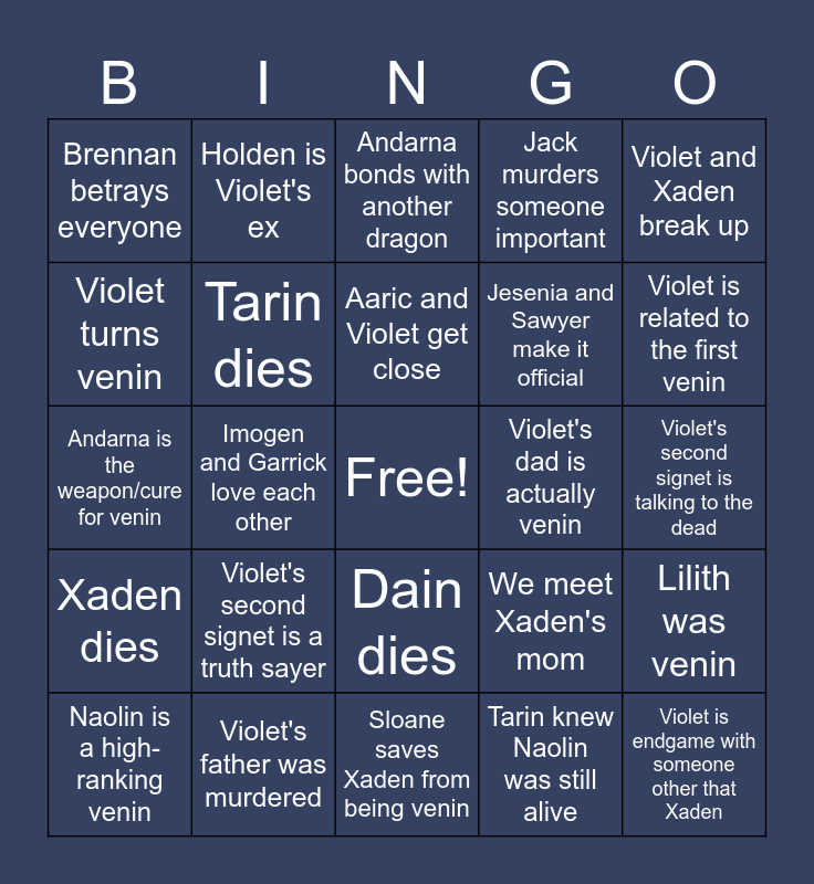 This bingo card has a free space and 24 words: Violet's second signet is a truth sayer, Violet's father was murdered, Aaric and Violet get close, Naolin is a high-ranking venin, Violet and Xaden break up, Brennan betrays everyone, Violet turns venin, Holden is Violet's ex, Violet's dad is actually venin, Dain dies, Jesenia and Sawyer make it official, Andarna is the weapon/cure for venin, We meet Xaden's mom, Lilith was venin, Tarin dies, Tarin knew Naolin was still alive, Violet's second signet is talking to the dead, Andarna bonds with another dragon, Violet is related to the first venin, Imogen and Garrick love each other, Violet is endgame with someone other that Xaden, Xaden dies, Jack murders someone important and Sloane saves Xaden from being venin.