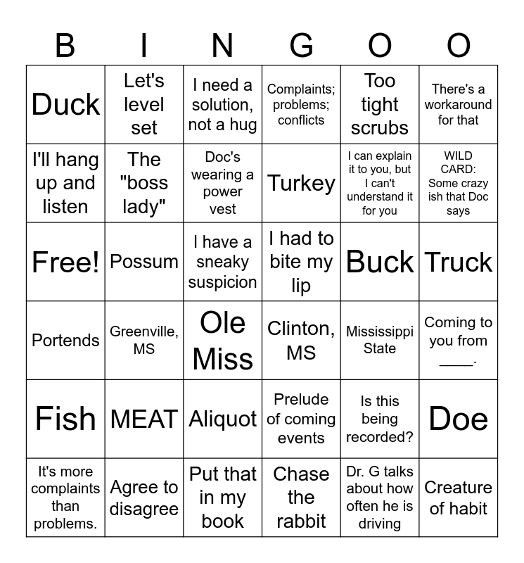 This bingo card has 36 words: Prelude of coming events, Aliquot, Chase the rabbit, I'll hang up and listen, Portends, I had to bite my lip, The "boss lady", Put that in my book, Too tight scrubs, Is this being recorded?, WILD CARD: Some crazy ish that Doc says, Complaints; problems; conflicts, Doe, Possum, Turkey, Duck, Fish, Buck, Free!, I need a solution, not a hug, I have a sneaky suspicion, Greenville, MS, Clinton, MS, Ole Miss, Mississippi State, Let's level set, I can explain it to you, but I can't understand it for you, Agree to disagree, Doc's wearing a power vest, There's a workaround for that, Creature of habit, It's more complaints than problems., Coming to you from ____., Truck, MEAT and Dr. G talks about how often he is driving.