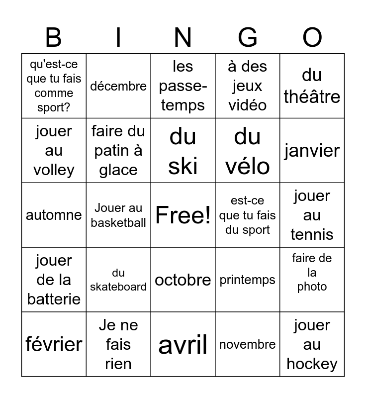 This bingo card has a free space and 38 words: faire de l'aérobic, faire de l'athlétisme, faire du jogging, faire du patin à glace, faire de la photo, du skateboard, du ski, du surf, du théâtre, du vélo, Jouer au basketball, à des jeux vidéo, jouer au hockey, jouer au tennis, jouer au volley, jouer de la batterie, jouer de la guitare, les passe-temps, qu'est-ce que, est-ce que tu fais du sport, qu'est-ce que tu fais comme sport?, Je ne fais rien, janvier, février, mars, avril, mai, juin, juillet, août, septembre, octobre, novembre, décembre, été, printemps, automne and hiver.