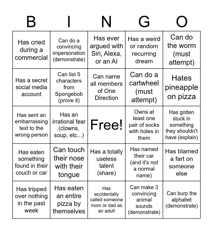 This bingo card has a free space and 24 words: Can touch their nose with their tongue, Has eaten an entire pizza by themselves, Can name all members of One Direction, Has tripped over nothing in the past week, Can do the worm (must attempt), Has cried during a commercial, Has a secret social media account, Can do a convincing impersonation (demonstrate), Owns at least one pair of socks with holes in them, Has a totally useless talent (share), Can do a cartwheel (must attempt), Has sent an embarrassing text to the wrong person, Has named their car (and it's not a normal name), Has blamed a fart on someone else, Can list 5 characters from Spongebob (prove it), Can make 3 convincing animal sounds (demonstrate), Has gotten stuck in something they shouldn't have (explain), Has ever argued with Siri, Alexa, or an AI, Hates pineapple on pizza, Has an irrational fear (clowns, soup, etc...), Can burp the alphabet (demonstrate), Has eaten something found in their couch or car, Has a weird or random recurring dream and Has accidentally called someone mom or dad as an adult.