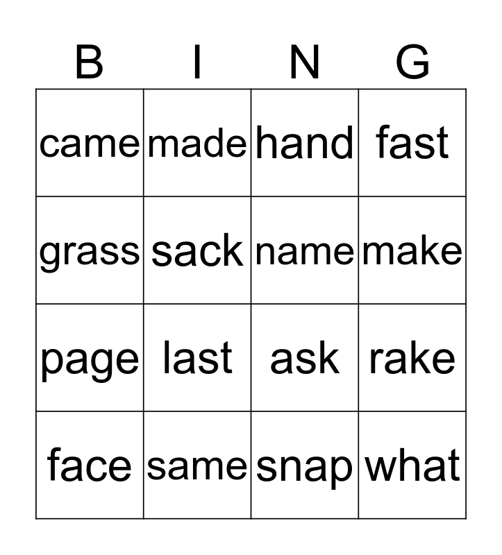 This bingo card has a free space and 15 words: face, what, hand, came, make, grass, last, snap, sack, page, rake, fast, name, made and same.
