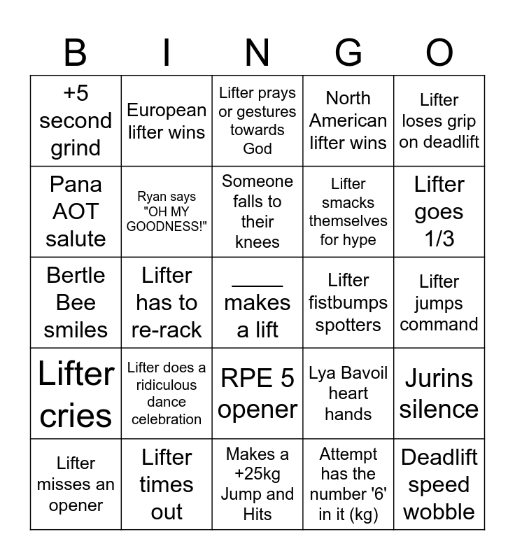 This bingo card has a free space and 29 words: Lifter misses an opener, Lifter breaks a record, Lifter has to re-rack, Jury overrules a lift, +5 second grind, Lifter prays or gestures towards God, Ryan says "OH MY GOODNESS!", Lifter does a ridiculous dance celebration, Lifter fistbumps spotters, Lifter times out, Lifter jumps command, Deadlift speed wobble, Makes a +25kg Jump and Hits, Attempt has the number '6' in it (kg), Lifter goes 1/3, Nosebleed, RPE 5 opener, Lifter cries, Lifter loses grip on deadlift, Bertle Bee smiles, Lya Bavoil heart hands, American lifter pounds their chest, Lifter smacks themselves for hype, Pana AOT salute, North American lifter wins, European lifter wins, Jurins silence, Someone falls to their knees and Lifter blows a kiss to the crowd.