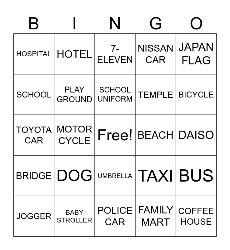 This bingo card has a free space and 24 words: DOG, BABY STROLLER, SCHOOL UNIFORM, JOGGER, JAPAN FLAG, HOSPITAL, SCHOOL, HOTEL, BEACH, UMBRELLA, TEMPLE, TOYOTA CAR, TAXI, BUS, PLAY GROUND, FAMILY MART, DAISO, 7- ELEVEN, BICYCLE, MOTOR CYCLE, COFFEE HOUSE, BRIDGE, NISSAN CAR and POLICE CAR.