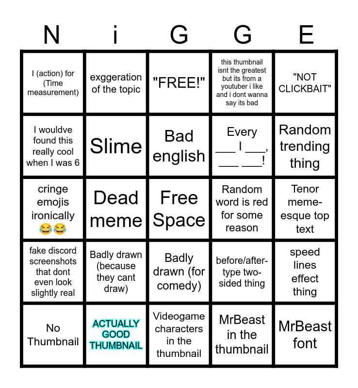 This bingo card has 1 images, a free space and 43 words: MrBeast font, Red arrow, No Thumbnail, Lots of text, MrBeast in the thumbnail, "FREE!", Literal clickbait (thumbnail unrelated to the video), "NOT CLICKBAIT", ACTUALLY GOOD THUMBNAIL, this thumbnail isnt the greatest but its from a youtuber i like and i dont wanna say its bad, Random word is red for some reason, Badly drawn (for comedy), Badly drawn (because they cant draw), That one render of a character everyone uses, Videogame characters in the thumbnail, low resolution JPEG image, cringe emojis ironically😂😂, cringe emojis unironically, Random trending thing, exggeration of the topic, That stupid SVG thing that SunnyV2 does, Text that just rephrases the title, I (action) for (Time measurement), Rage bait, Tenor meme-esque top text, Minecraft texture, Face on the side of an image, before/after-type two-sided thing, fake discord screenshots that dont even look slightly real, bar on a random dude's eyes, speed lines effect thing, Minecraft HUD and arm with something in front of the "player", Minecraft player taking damage, Dead meme, Dhar Mann lookin text, Did Aphmau make this?, ___ VS ___, Bad english, I wouldve found this really cool when I was 6, Every ___ I ___, ___ ___!, Memoji, Slime and 3AM Video.