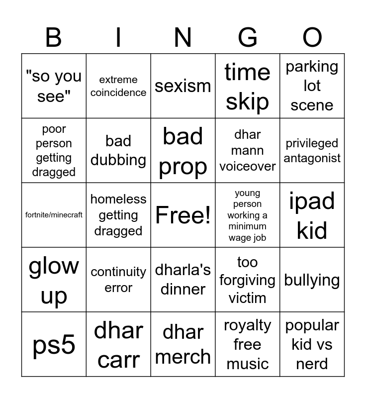 This bingo card has a free space and 24 words: continuity error, dhar carr, bad prop, ps5, parking lot scene, "so you see", poor person getting dragged, extreme coincidence, young person working a minimum wage job, dharla's dinner, dhar mann voiceover, fortnite/minecraft, too forgiving victim, bullying, bad dubbing, royalty free music, ipad kid, sexism, privileged antagonist, homeless getting dragged, popular kid vs nerd, glow up, time skip and dhar merch.