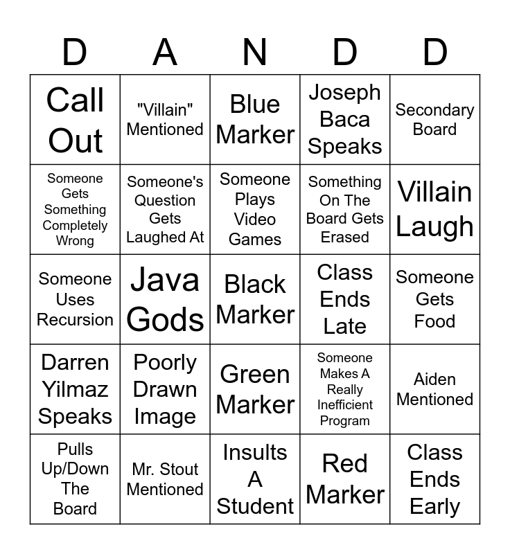 This bingo card has a free space and 24 words: Poorly Drawn Image, Mr. Stout Mentioned, Someone Plays Video Games, Pulls Up/Down The Board, Secondary Board, Call Out, Someone Gets Something Completely Wrong, "Villain" Mentioned, Class Ends Late, Green Marker, Something On The Board Gets Erased, Someone Uses Recursion, Someone Makes A Really Inefficient Program, Aiden Mentioned, Someone's Question Gets Laughed At, Red Marker, Someone Gets Food, Blue Marker, Villain Laugh, Java Gods, Class Ends Early, Darren Yilmaz Speaks, Joseph Baca Speaks and Insults A Student.