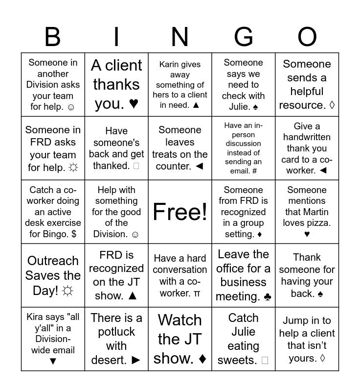 This bingo card has a free space and 24 words: FRD is recognized on the JT show. ▲, There is a potluck with desert. ►, Someone leaves treats on the counter. ◄, Kira says "all y'all" in a Division-wide email ▼, Someone sends a helpful resource. ◊, Someone in another Division asks your team for help. ☺, Someone in FRD asks your team for help. ☼, A client thanks you. ♥, Someone from FRD is recognized in a group setting. ♦, Have a hard conversation with a co-worker. π, Have an in-person discussion instead of sending an email. #, Catch a co-worker doing an active desk exercise for Bingo. $, Leave the office for a business meeting. ♣, Thank someone for having your back. ♠, Have someone's back and get thanked. ֎, Catch Julie eating sweets. ֎, Someone mentions that Martin loves pizza. ♥, Karin gives away something of hers to a client in need. ▲, Give a handwritten thank you card to a co-worker. ◄, Help with something for the good of the Division. ☺, Jump in to help a client that isn’t yours. ◊, Outreach Saves the Day! ☼, Someone says we need to check with Julie. ♠ and Watch the JT show. ♦.