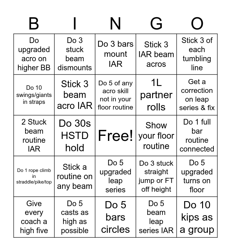 This bingo card has a free space and 24 words: Stick a routine on any beam, Do 5 casts as high as possible, Do 5 of any acro skill not in your floor routine, Give every coach a high five, Stick 3 of each tumbling line, Do upgraded acro on higher BB, Do 10 swings/giants in straps, Do 3 stuck beam dismounts, Show your floor routine, Do 5 upgraded leap series, 1L partner rolls, 2 Stuck beam routine IAR, Do 3 stuck straight jump or FT off height, Do 5 upgraded turns on floor, Stick 3 beam acro IAR, Do 5 beam leap series IAR, Do 1 full bar routine connected, Do 3 bars mount IAR, Get a correction on leap series & fix, Do 30s HSTD hold, Do 10 kips as a group, Do 1 rope climb in straddle/pike/top, Stick 3 IAR beam acros and Do 5 bars circles.