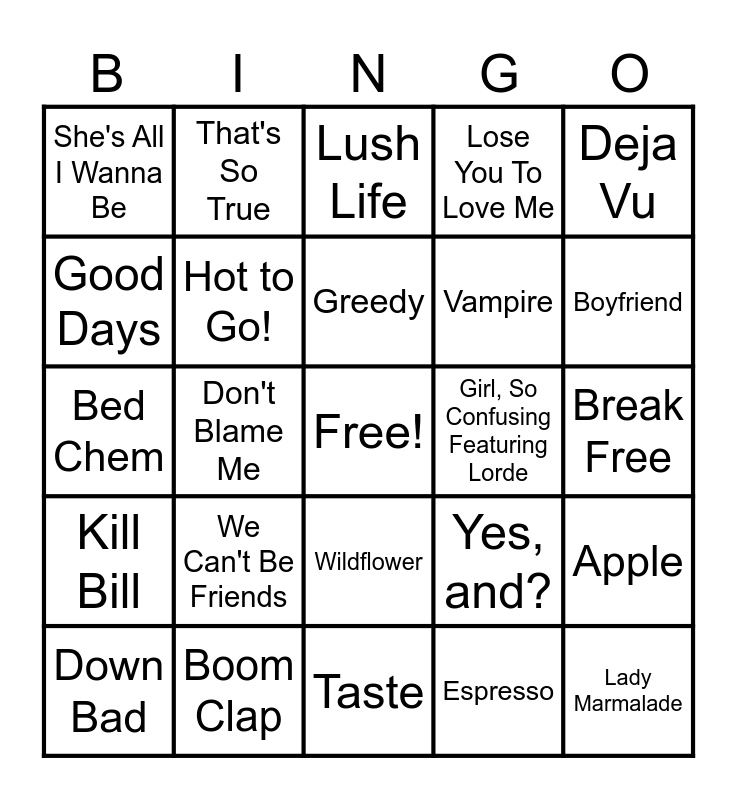 This bingo card has a free space and 52 words: Good Luck, Babe!, Lady Marmalade, Diet Pepsi, Taste, We Can't Be Friends, Birds of a Feather, That's So True, Messy, Good Days, Ceilings, Hot to Go!, Please Please Please, Apple, Yes, and?, August, Nonsense, Greedy, Girl, So Confusing Featuring Lorde, Reckless, Deja Vu, Don't Blame Me, Espresso, She's All I Wanna Be, Vampire, Too Well, You Broke Me First, Cruel Summer, Lover, Boyfriend, Party in the U.S.A., The Man, Lose You To Love Me, Positions, Used to be Young, Drivers License, Lush Life, Boom Clap, Thank u, next, Need to Know, Without Me, Thumbs, Break Free, Kill Bill, Die With A Smile, Wildflower, Pink Pony Club, Run for the Hills, Bed Chem, The Boy is Mine, It's ok I'm ok, Down Bad and Eternal Sunshine.