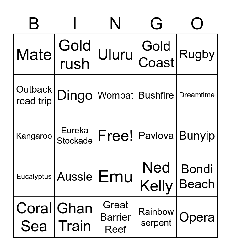 This bingo card has a free space and 60 words: Nullarbor Plain, Ghan Train, Southern Cross, Eucalyptus, Rainbow serpent, Sydney Opera House, Dingo, Didgeridoo, Bushfire, Kakadu, Gold Coast, Koala, Outback road trip, Blue Mountains, Tim Tams, Mate, Opera, Rugby, Crocodile Dundee, Wombat, Pavlova, Uluru, Coral Sea, Bondi Beach, Bushwalking, Wine (Shiraz), Boomerang, Crocodile, Dreamtime, Bush tucker, Kangaroo Island, Shark Bay, G'day, Northern Territory, Gold rush, Akubra, Fair dinkum, Eureka Stockade, Great Ocean Road, Kangaroo, Lamington, Aussie, Bunyip, Barbecue, Ned Kelly, AFL (Australian Football League), Snorkeling, Queensland, Thongs (flip-flops), Emu, Great Barrier Reef, Aussie Rules, Sydney Harbour Bridge, Echidna, Bush, Hunter Valley, Boab tree, Platypus, Tim Tams and Vegemite.