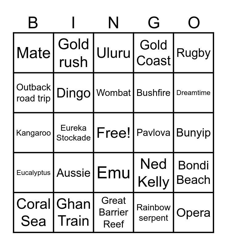 This bingo card has a free space and 60 words: Nullarbor Plain, Ghan Train, Southern Cross, Eucalyptus, Rainbow serpent, Sydney Opera House, Dingo, Didgeridoo, Bushfire, Kakadu, Gold Coast, Koala, Outback road trip, Blue Mountains, Tim Tams, Mate, Opera, Rugby, Crocodile Dundee, Wombat, Pavlova, Uluru, Coral Sea, Bondi Beach, Bushwalking, Wine (Shiraz), Boomerang, Crocodile, Dreamtime, Bush tucker, Kangaroo Island, Shark Bay, G'day, Northern Territory, Gold rush, Akubra, Fair dinkum, Eureka Stockade, Great Ocean Road, Kangaroo, Lamington, Aussie, Bunyip, Barbecue, Ned Kelly, AFL (Australian Football League), Snorkeling, Queensland, Thongs (flip-flops), Emu, Great Barrier Reef, Aussie Rules, Sydney Harbour Bridge, Echidna, Bush, Hunter Valley, Boab tree, Platypus, Tim Tams and Vegemite.