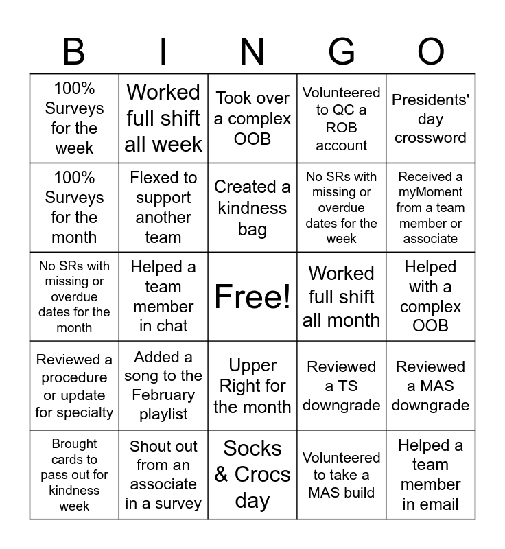 This bingo card has a free space and 25 words: Added a song to the February playlist, Socks & Crocs day, Created a kindness bag, Brought cards to pass out for kindness week, Presidents' day crossword, 100% Surveys for the week, 100% Surveys for the month, Worked full shift all week, Worked full shift all month, Upper Right for the month, No SRs with missing or overdue dates for the week, No SRs with missing or overdue dates for the month, Reviewed a TS downgrade, Reviewed a MAS downgrade, Flexed to support another team, Reviewed a Control email, Helped with a complex OOB, Took over a complex OOB, Received a myMoment from a team member or associate, Helped a team member in chat, Helped a team member in email, Shout out from an associate in a survey, Reviewed a procedure or update for specialty, Volunteered to QC a ROB account and Volunteered to take a MAS build.