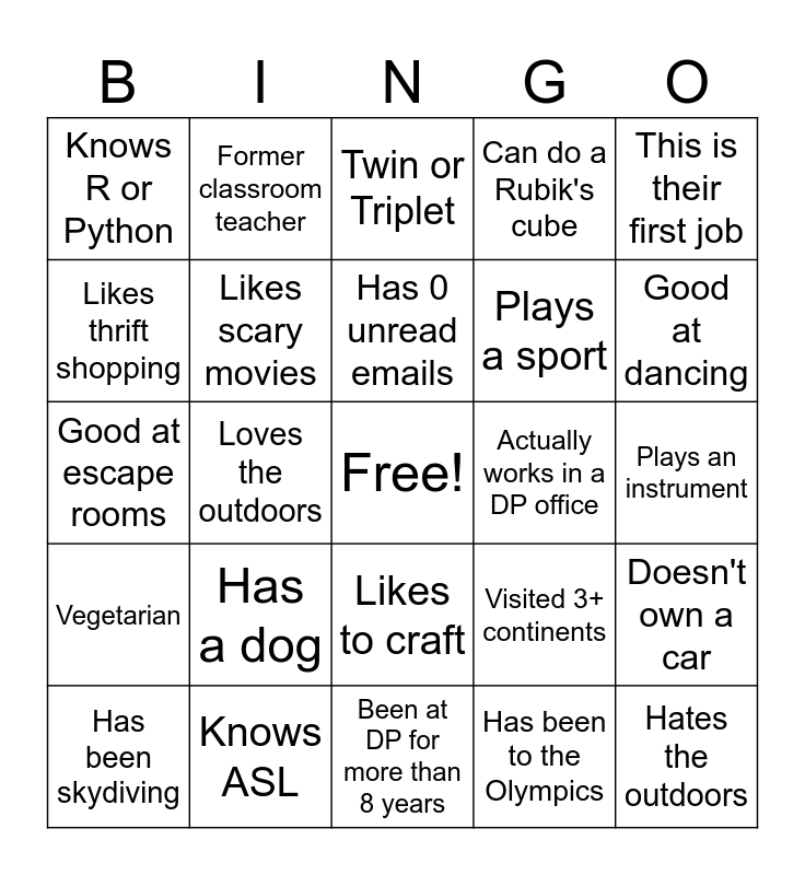 This bingo card has a free space and 24 words: Has a dog, Knows ASL, Has 0 unread emails, Has been skydiving, This is their first job, Knows R or Python, Likes thrift shopping, Former classroom teacher, Actually works in a DP office, Likes to craft, Plays a sport, Good at escape rooms, Visited 3+ continents, Doesn't own a car, Likes scary movies, Has been to the Olympics, Plays an instrument, Twin or Triplet, Good at dancing, Loves the outdoors, Hates the outdoors, Vegetarian, Can do a Rubik's cube and Been at DP for more than 8 years.
