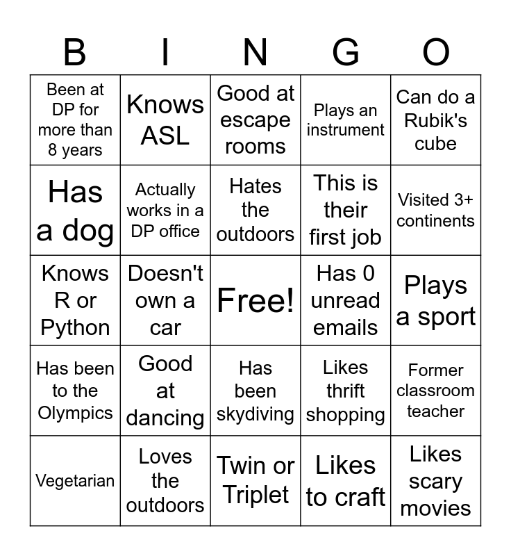 This bingo card has a free space and 24 words: Good at dancing, Loves the outdoors, Hates the outdoors, Vegetarian, Can do a Rubik's cube, Been at DP for more than 8 years, Has a dog, Knows ASL, Has 0 unread emails, Has been skydiving, This is their first job, Knows R or Python, Likes thrift shopping, Former classroom teacher, Actually works in a DP office, Likes to craft, Plays a sport, Good at escape rooms, Visited 3+ continents, Doesn't own a car, Likes scary movies, Has been to the Olympics, Plays an instrument and Twin or Triplet.