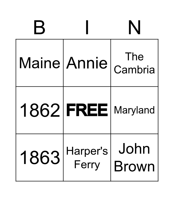 This bingo card has a free space and 11 words: Virginia, Harper's Ferry, John Brown, 1863, Annie, The Cambria, Maryland, 1861, 1862, Maine and Mary.