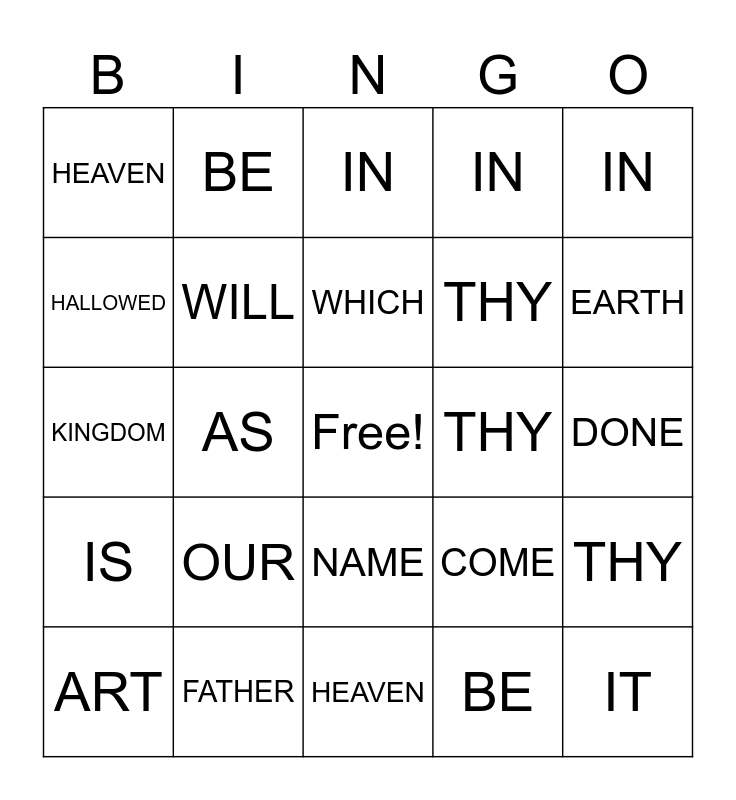 This bingo card has a free space and 24 words: OUR, FATHER, WHICH, ART, IN, HEAVEN, HALLOWED, BE, THY, NAME, THY, KINGDOM, COME, THY, WILL, BE, DONE, IN, EARTH, AS, IT, IS, IN and HEAVEN.