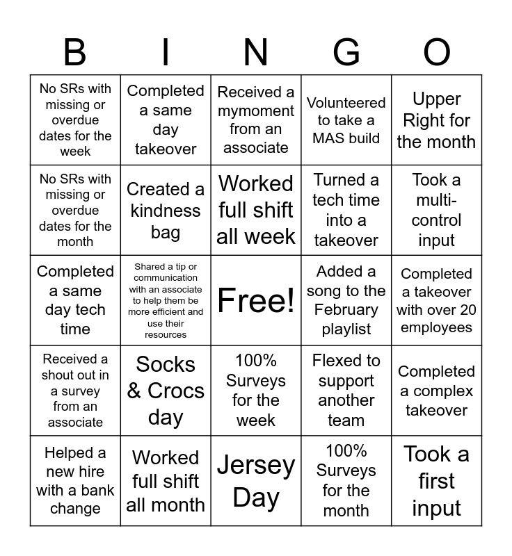 This bingo card has a free space and 26 words: 100% Surveys for the week, 100% Surveys for the month, Worked full shift all week, Worked full shift all month, Upper Right for the month, No SRs with missing or overdue dates for the week, No SRs with missing or overdue dates for the month, Completed a same day takeover, Completed a takeover with over 20 employees, Flexed to support another team, Turned a tech time into a takeover, Completed a same day tech time, Completed a complex takeover, Helped a new hire with a bank change, Shared a tip or communication with an associate to help them be more efficient and use their resources, Volunteered to QC a ROB account, Volunteered to take a MAS build, Received a shout out in a survey from an associate, Received a mymoment from an associate, Took a first input, Took a multi-control input, Jersey Day, Added a song to the February playlist, Socks & Crocs day, Created a kindness bag and Brought cards to pass out for kindness week.