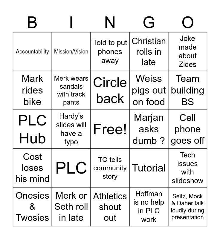This bingo card has a free space and 24 words: PLC, Merk or Seth roll in late, Circle back, Onesies & Twosies, Joke made about Zides, Accountability, Mark rides bike, Mission/Vision, Marjan asks dumb ?, TO tells community story, Weiss pigs out on food, PLC Hub, Tutorial, Tech issues with slideshow, Merk wears sandals with track pants, Hoffman is no help in PLC work, Cell phone goes off, Told to put phones away, Team building BS, Hardy's slides will have a typo, Seitz, Mock & Daher talk loudly during presentation, Cost loses his mind, Christian rolls in late and Athletics shout out.