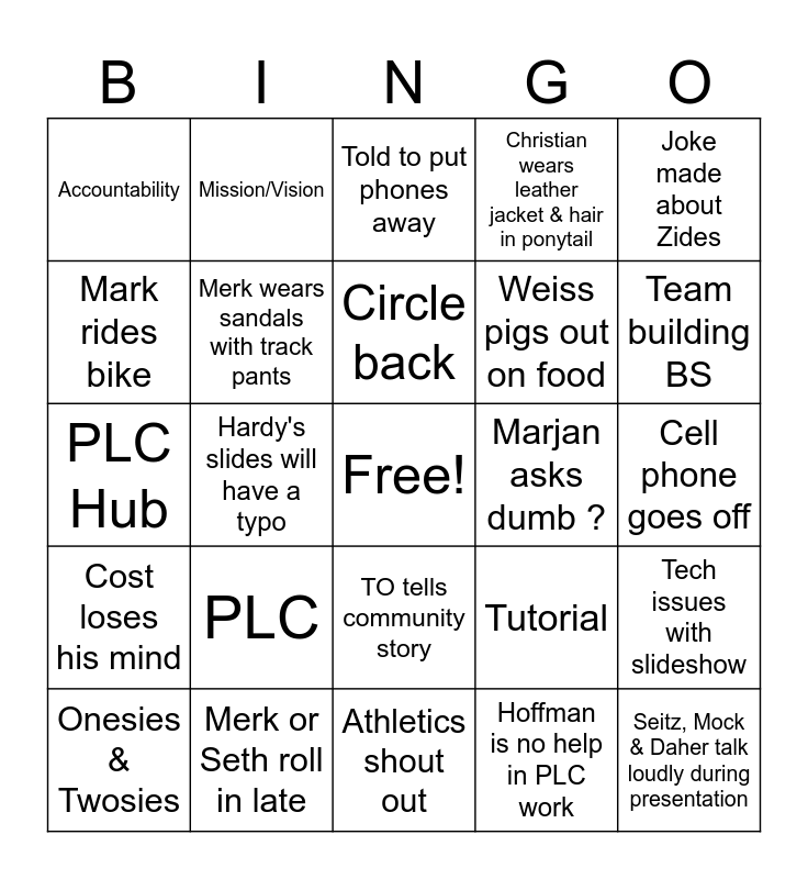 This bingo card has a free space and 24 words: PLC, Merk or Seth roll in late, Circle back, Onesies & Twosies, Joke made about Zides, Accountability, Mark rides bike, Mission/Vision, Marjan asks dumb ?, TO tells community story, Weiss pigs out on food, PLC Hub, Tutorial, Tech issues with slideshow, Merk wears sandals with track pants, Hoffman is no help in PLC work, Cell phone goes off, Told to put phones away, Team building BS, Hardy's slides will have a typo, Seitz, Mock & Daher talk loudly during presentation, Cost loses his mind, Christian wears leather jacket & hair in ponytail and Athletics shout out.