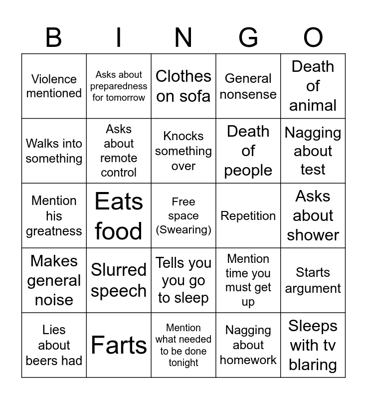 This bingo card has a free space and 24 words: Slurred speech, Farts, Knocks something over, Lies about beers had, Death of animal, Violence mentioned, Walks into something, Asks about preparedness for tomorrow, Repetition, Tells you you go to sleep, Death of people, Mention his greatness, Mention time you must get up, Starts argument, Asks about remote control, Nagging about homework, Asks about shower, Clothes on sofa, Nagging about test, Eats food, Sleeps with tv blaring, Makes general noise, General nonsense and Mention what needed to be done tonight.