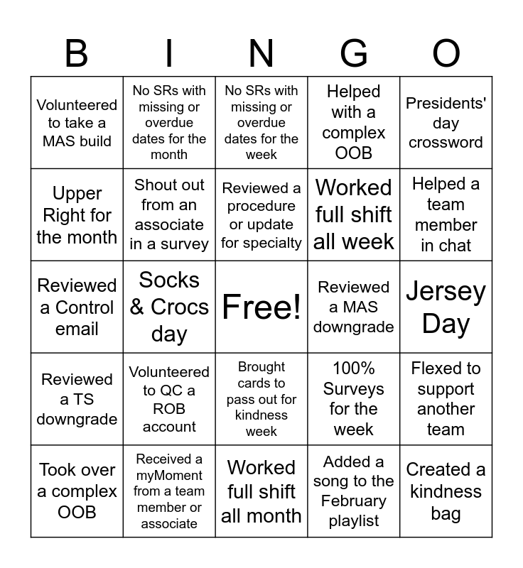 This bingo card has a free space and 27 words: 100% Surveys for the week, 100% Surveys for the month, Worked full shift all week, Worked full shift all month, Upper Right for the month, No SRs with missing or overdue dates for the week, No SRs with missing or overdue dates for the month, Reviewed a TS downgrade, Reviewed a MAS downgrade, Flexed to support another team, Reviewed a Control email, Helped with a complex OOB, Took over a complex OOB, Received a myMoment from a team member or associate, Helped a team member in chat, Helped a team member in email, Shout out from an associate in a survey, Reviewed a procedure or update for specialty, Volunteered to QC a ROB account, Volunteered to take a MAS build, Jersey Day, Added a song to the February playlist, Socks & Crocs day, Created a kindness bag, Brought cards to pass out for kindness week, Presidents' day crossword and West fest – dress up in your band t-shirt.