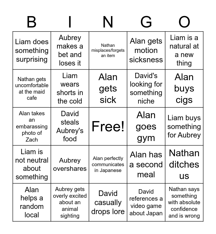 This bingo card has a free space and 24 words: Aubrey overshares, Aubrey gets overly excited about an animal sighting, Alan gets sick, Alan helps a random local, Liam is a natural at a new thing, Liam does something surprising, Nathan gets uncomfortable at the maid cafe, Aubrey makes a bet and loses it, Alan goes gym, Alan perfectly communicates in Japanese, David's looking for something niche, Alan takes an embarassing photo of Zach, Alan has a second meal, Nathan ditches us, Liam wears shorts in the cold, David references a video game about Japan, Liam buys something for Aubrey, Nathan misplaces/forgets an item, Alan buys cigs, David steals Aubrey's food, Nathan says something with absolute confidence and is wrong, Liam is not neutral about something, Alan gets motion sicksness and David casually drops lore.