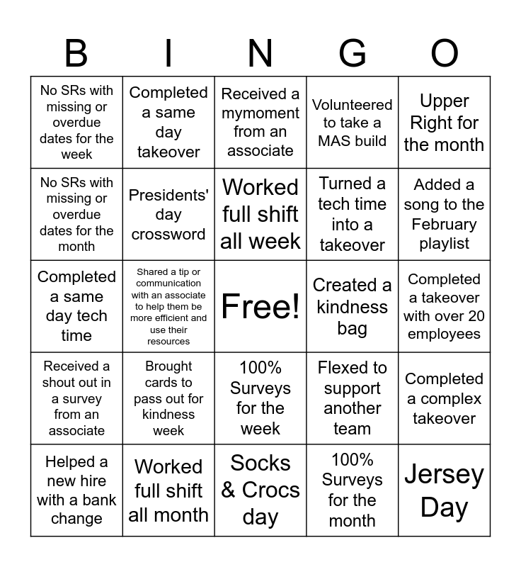 This bingo card has a free space and 26 words: 100% Surveys for the week, 100% Surveys for the month, Worked full shift all week, Worked full shift all month, Upper Right for the month, No SRs with missing or overdue dates for the week, No SRs with missing or overdue dates for the month, Completed a same day takeover, Completed a takeover with over 20 employees, Flexed to support another team, Turned a tech time into a takeover, Completed a same day tech time, Completed a complex takeover, Helped a new hire with a bank change, Shared a tip or communication with an associate to help them be more efficient and use their resources, Volunteered to QC a ROB account, Volunteered to take a MAS build, Received a shout out in a survey from an associate, Received a mymoment from an associate, Jersey Day, Added a song to the February playlist, Socks & Crocs day, Created a kindness bag, Brought cards to pass out for kindness week, Presidents' day crossword and West fest – dress up in your band t-shirt.