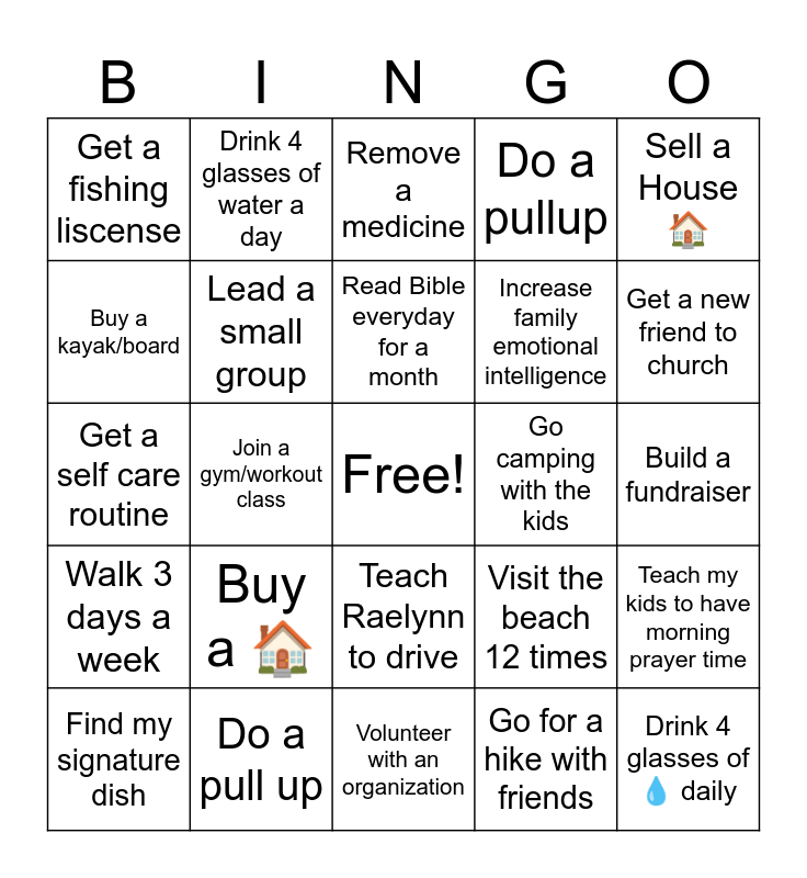 This bingo card has a free space and 24 words: Buy a π , Do a pull up, Read Bible everyday for a month, Find my signature dish, Sell a House π , Get a fishing liscense, Buy a kayak/board, Drink 4 glasses of water a day, Go camping with the kids, Teach Raelynn to drive, Increase family emotional intelligence, Get a self care routine, Visit the beach 12 times, Teach my kids to have morning prayer time, Lead a small group, Go for a hike with friends, Build a fundraiser, Remove a medicine, Get a new friend to church, Join a gym/workout class, Drink 4 glasses of π§ daily, Walk 3 days a week, Do a pullup and Volunteer with an organization.
