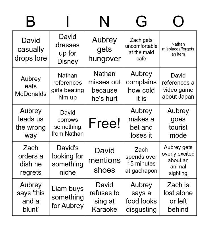 This bingo card has a free space and 24 words: David's looking for something niche, Liam buys something for Aubrey, Nathan misses out because he's hurt, Aubrey says 'this and a blunt', Nathan misplaces/forgets an item, David casually drops lore, Aubrey eats McDonalds, David dresses up for Disney, Aubrey makes a bet and loses it, David mentions shoes, Aubrey complains how cold it is, Aubrey leads us the wrong way, Zach spends over 15 minutes at gachapon, Aubrey gets overly excited about an animal sighting, Nathan references girls beating him up, Aubrey says a food looks disgusting, Aubrey goes tourist mode, Aubrey gets hungover, David references a video game about Japan, David borrows something from Nathan, Zach is lost alone or left behind, Zach orders a dish he regrets, Zach gets uncomfortable at the maid cafe and David refuses to sing at Karaoke.