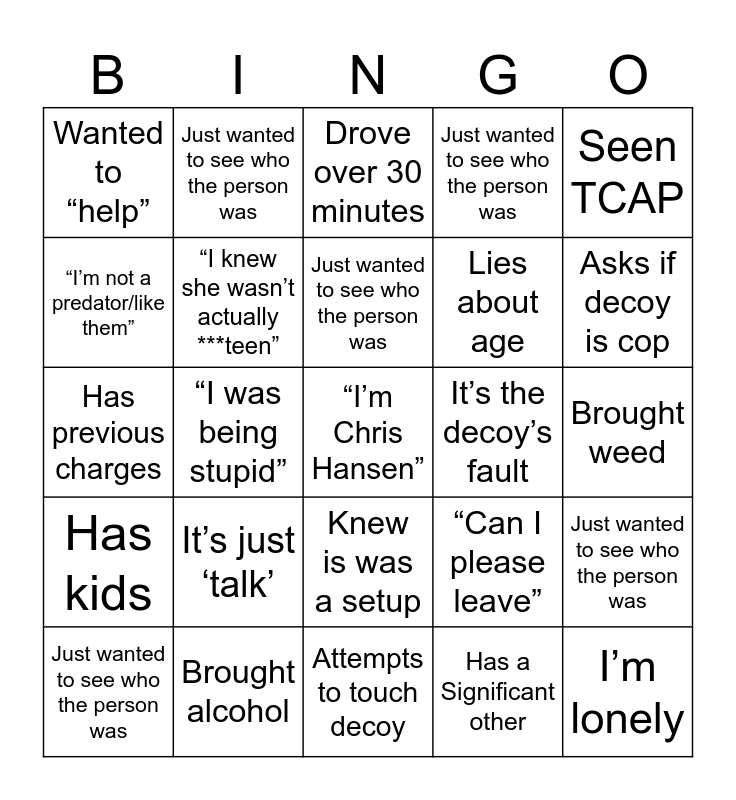 This bingo card has a free space and 29 words: Just wanted to see who the person was, No real intentions, “I was being stupid”, “I’ve never done this before”, Wanted to “help”, Drove over 30 minutes, “I knew she wasn’t actually ***teen”, It’s just ‘talk’, It’s the decoy’s fault, Brought alcohol, Brought weed, I’m lonely, Attempts to touch decoy, Has a Significant other, Asks if decoy is cop, “I always have *item* with me”, Knew is was a setup, Has kids, Seen TCAP, Has previous charges, “Can I please leave”, “Am I under arrest?”, Lies about age, “I’m not a predator/like them”, Just wanted to see who the person was, Just wanted to see who the person was, Just wanted to see who the person was, Just wanted to see who the person was and Just wanted to see who the person was.