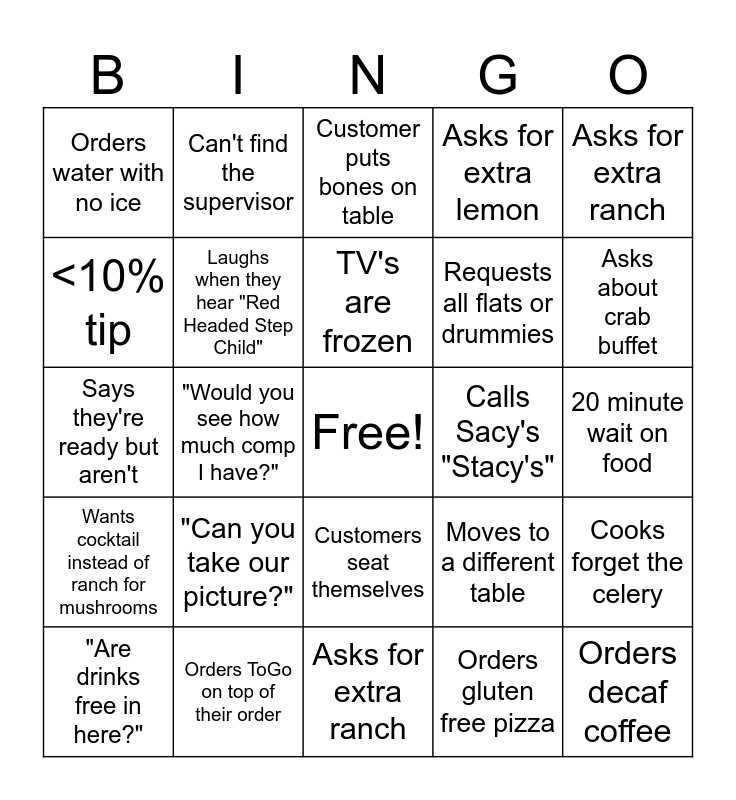 This bingo card has a free space and 29 words: "Are drinks free in here?", "This beer had a hole in it", "Would you see how much comp I have?", Orders a sportsman on rye bread, Orders water with no ice, Customer puts bones on table, Laughs when they hear "Red Headed Step Child", "Can you take our picture?", Calls Sacy's "Stacy's", Orders ToGo on top of their order, 20 minute wait on food, Orders decaf coffee, Asks for extra ranch, Orders gluten free pizza, Asks about crab buffet, Someone steals your food, Customers seat themselves, Wants cocktail instead of ranch for mushrooms, Asks for extra ranch, Says they're ready but aren't, Moves to a different table, Table has joiners, Requests all flats or drummies, <10% tip, Asks for extra lemon, Can't find the supervisor, Cooks forget the celery, TV's are frozen and Customer asks for the channel to be changed.