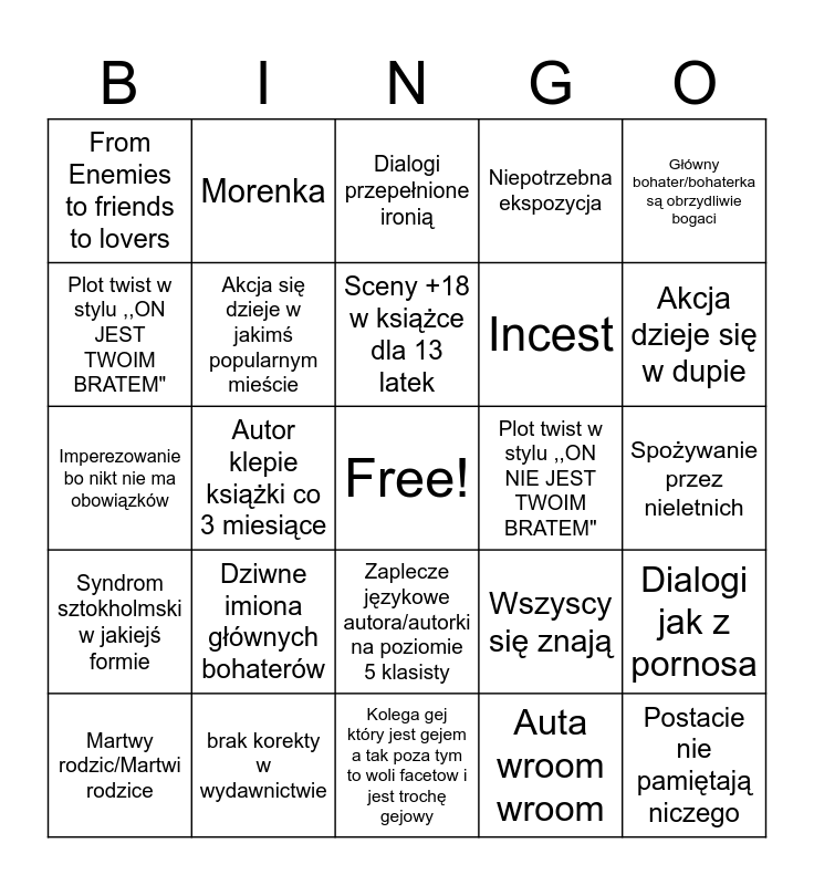 This bingo card has a free space and 24 words: Dziwne imiona głównych bohaterów, brak korekty w wydawnictwie, Sceny +18 w książce dla 13 latek, Martwy rodzic/Martwi rodzice, Główny bohater/bohaterka są obrzydliwie bogaci, From Enemies to friends to lovers, Plot twist w stylu ,,ON JEST TWOIM BRATEM", Morenka, Plot twist w stylu ,,ON NIE JEST TWOIM BRATEM", Zaplecze językowe autora/autorki na poziomie 5 klasisty, Incest, Imperezowanie bo nikt nie ma obowiązków, Wszyscy się znają, Dialogi jak z pornosa, Akcja się dzieje w jakimś popularnym mieście, Auta wroom wroom, Spożywanie przez nieletnich, Dialogi przepełnione ironią, Akcja dzieje się w dupie, Autor klepie książki co 3 miesiące, Postacie nie pamiętają niczego, Syndrom sztokholmski w jakiejś formie, Niepotrzebna ekspozycja and Kolega gej który jest gejem a tak poza tym to woli facetow i jest trochę gejowy.