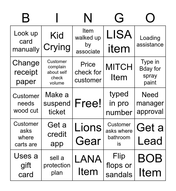 This bingo card has a free space and 34 words: Bald Man, Flip flops or sandals, Big Dog, Customer needs key made, Customer asks where carts are, Customer complain about self check volume, Loading assistance, Uses a gift card, Kid Crying, Stop an invalid scan, Price check for customer, Item walked up by associate, "Can I get a discount?", Customer asks about hot dogs, typed in pro number, Type in Bday for spray paint, sell a protection plan, Customer needs wood cut, Get a credit app, Customer asks where bathroom is, Lions Gear, Customer Ignores you, Look up card manually, Need manager approval, LANA Item, BOB Item, LISA item, MAC item, MITCH Item, Change receipt paper, Reboot register, Make a suspend ticket, Get a Lead and Write a Brovo.