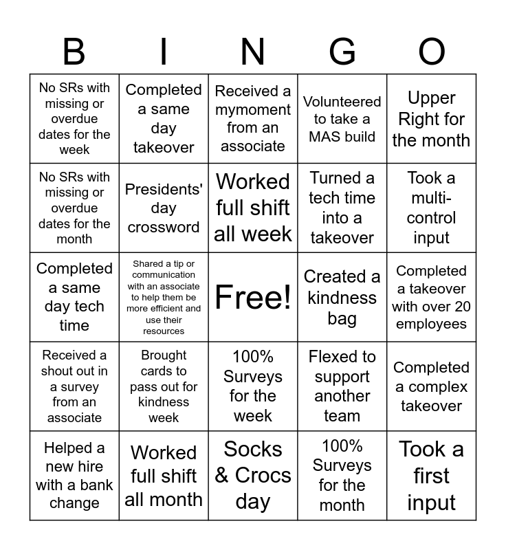This bingo card has a free space and 26 words: 100% Surveys for the week, 100% Surveys for the month, Worked full shift all week, Worked full shift all month, Upper Right for the month, No SRs with missing or overdue dates for the week, No SRs with missing or overdue dates for the month, Completed a same day takeover, Completed a takeover with over 20 employees, Flexed to support another team, Turned a tech time into a takeover, Completed a same day tech time, Completed a complex takeover, Helped a new hire with a bank change, Shared a tip or communication with an associate to help them be more efficient and use their resources, Volunteered to QC a ROB account, Volunteered to take a MAS build, Received a shout out in a survey from an associate, Received a mymoment from an associate, Took a first input, Took a multi-control input, Socks & Crocs day, Created a kindness bag, Brought cards to pass out for kindness week, Presidents' day crossword and West fest – dress up in your band t-shirt.