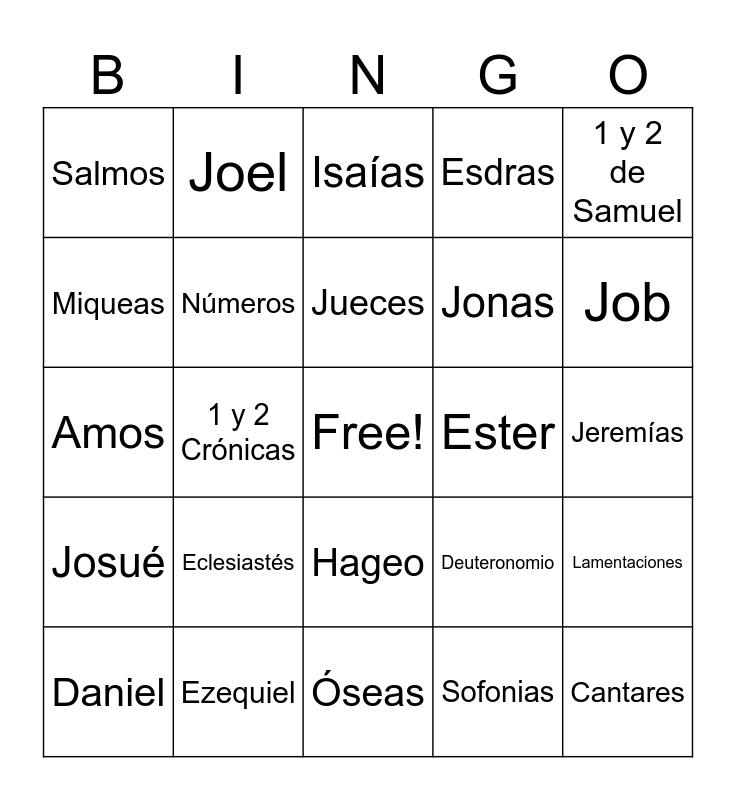 This bingo card has a free space and 36 words: Génesis, Éxodo, Levítico, Números, Deuteronomio, Josué, Jueces, Rut, 1 y 2 de Samuel, 1 y 2 de Reyes, 1 y 2 Crónicas, Esdras, Nehemias, Ester, Job, Salmos, Proverbios, Eclesiastés, Cantares, Isaías, Jeremías, Lamentaciones, Ezequiel, Daniel, Óseas, Joel, Amos, Abdias, Jonas, Miqueas, Nahum, Habacuc, Sofonias, Hageo, Zacarías and Malaquias.