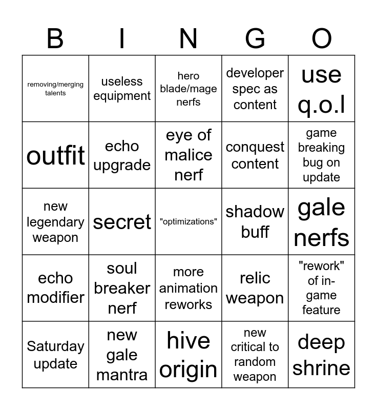 This bingo card has a free space and 24 words: soul breaker nerf, new gale mantra, eye of malice nerf, Saturday update, use q.o.l, removing/merging talents, outfit, useless equipment, shadow buff, more animation reworks, conquest content, new legendary weapon, relic weapon, "rework" of in-game feature, echo upgrade, new critical to random weapon, gale nerfs, hero blade/mage nerfs, game breaking bug on update, secret, deep shrine, echo modifier, developer spec as content and hive origin.