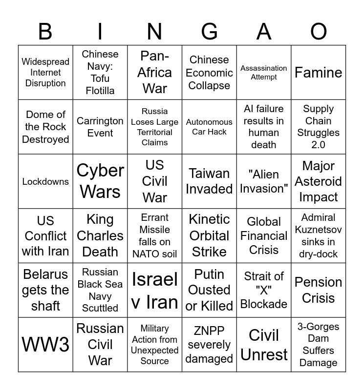 This bingo card has 39 words: Russian Civil War, WW3, Disease X, Dome of the Rock Destroyed, Errant Missile falls on NATO soil, Major Asteroid Impact, Carrington Event, 3-Gorges Dam Suffers Damage, Assassination Attempt, Taiwan Invaded, Supply Chain Struggles 2.0, Chinese Economic Collapse, Lockdowns, US Civil War, Cyber Wars, "Alien Invasion", Strait of "X" Blockade, Widespread Internet Disruption, Military Action from Unexpected Source, US Conflict with Iran, Famine, Global Financial Crisis, Russia Loses Large Territorial Claims, Autonomous Car Hack, ZNPP severely damaged, Israel v Iran, Belarus gets the shaft, Civil Unrest, Russian Black Sea Navy Scuttled, Chinese Navy: Tofu Flotilla, USD no longer Global Standard, Pension Crisis, Pan-Africa War, Kinetic Orbital Strike, Admiral Kuznetsov sinks in dry-dock, Putin Ousted or Killed, King Charles Death, AI failure results in human death and Another Boeing Plane Crash.