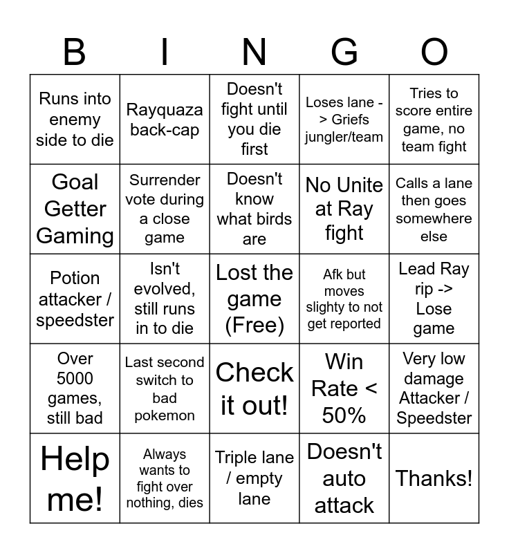This bingo card has a free space and 45 words: Afk, Thanks!, I need backup!, Help me!, Pushes Regi into own goal, Doesn't auto attack, Doesn't fight until you die first, Farms entire game, no team fight, Tries to score entire game, no team fight, Always wants to fight over nothing, dies, Loses lane -> Griefs jungler/team, Afk but moves slighty to not get reported, Check it out!, Last second switch to bad pokemon, Steals jungle, Triple lane / empty lane, Dies in lane -> lane switch, Potion attacker / speedster, Really bad held items, Calls a lane then goes somewhere else, Rayquaza back-cap, Being weird instead of being at Ray, Doesn't rotate to Regis, Runs into enemy side to die, Runs around somewhere and does nothing, Lead Ray rip -> Lose game, Bush Rayquaza man, Dies before scoring on Regieleki goal, Win Rate < 50%, Over 5000 games, still bad, Raging on mic, Very low damage Attacker / Speedster, Supporter / Defender doesn't support / defend, Duo / Trio, but they all play bad, Unite move right before Ray fight, Isn't evolved, still runs in to die, Jungler ganks lane and stays there forever, Steals bunny just to go back into their lane, Small overcap before high overcap can score, Doesn't know what birds are, Goal Getter Gaming, No Unite at Ray fight, Not scoring or defending after Ray, Surrender vote during a close game and Could stop goal, jumps somewhere else.