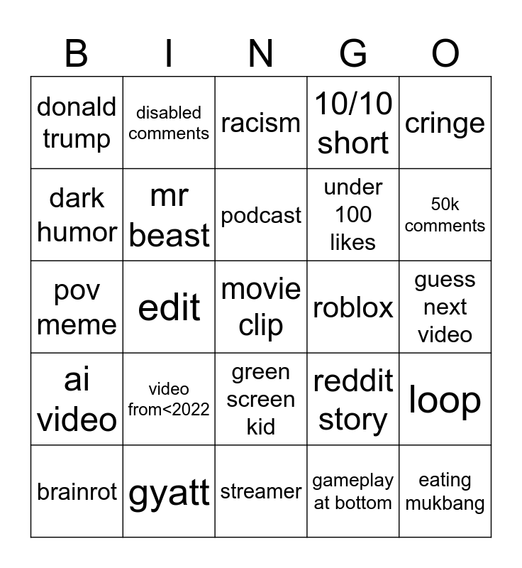 This bingo card has 25 words: video from<2022, streamer, podcast, brainrot, cringe, donald trump, dark humor, disabled comments, roblox, green screen kid, under 100 likes, pov meme, reddit story, loop, mr beast, eating mukbang, guess next video, racism, 50k comments, edit, movie clip, gyatt, ai video, 10/10 short and gameplay at bottom.