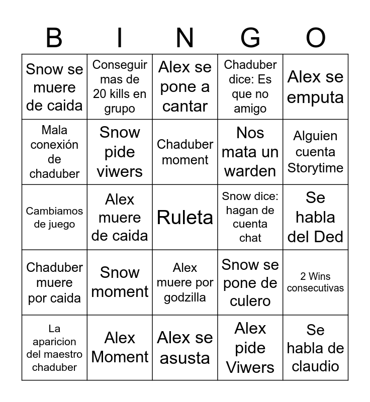 This bingo card has a free space and 24 words: Snow moment, Alex Moment, Chaduber moment, La aparicion del maestro chaduber, Alex se emputa, Snow se muere de caida, Mala conexión de chaduber, Conseguir mas de 20 kills en grupo, Snow dice: hagan de cuenta chat, Alex muere por godzilla, Nos mata un warden, Cambiamos de juego, Snow se pone de culero, 2 Wins consecutivas, Snow pide viwers, Alex pide Viwers, Se habla del Ded, Alex se pone a cantar, Alguien cuenta Storytime, Alex muere de caida, Se habla de claudio, Chaduber muere por caida, Chaduber dice: Es que no amigo and Alex se asusta.