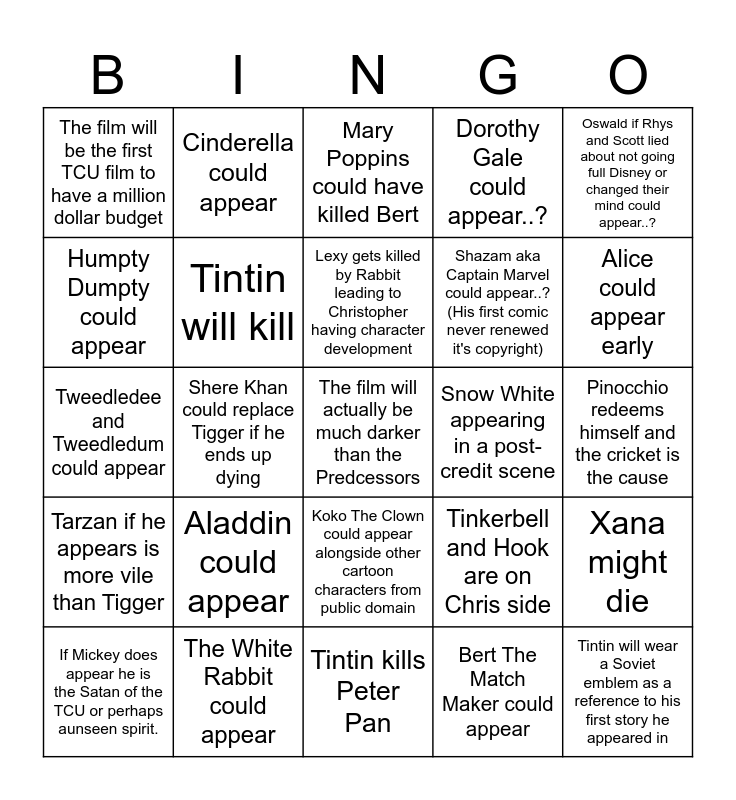 This bingo card has a free space and 24 words: Aladdin could appear, The White Rabbit could appear, Lexy gets killed by Rabbit leading to Christopher having character development, If Mickey does appear he is the Satan of the TCU or perhaps aunseen spirit., Oswald if Rhys and Scott lied about not going full Disney or changed their mind could appear..?, The film will be the first TCU film to have a million dollar budget, Humpty Dumpty could appear, Cinderella could appear, Snow White appearing in a post-credit scene, Koko The Clown could appear alongside other cartoon characters from public domain, Shazam aka Captain Marvel could appear..? (His first comic never renewed it's copyright), Tweedledee and Tweedledum could appear, Tinkerbell and Hook are on Chris side, Xana might die, Tintin will kill, Bert The Match Maker could appear, Pinocchio redeems himself and the cricket is the cause, Mary Poppins could have killed Bert, Alice could appear early, Shere Khan could replace Tigger if he ends up dying, Tintin will wear a Soviet emblem as a reference to his first story he appeared in, Tarzan if he appears is more vile than Tigger, Dorothy Gale could appear..? and Tintin kills Peter Pan.