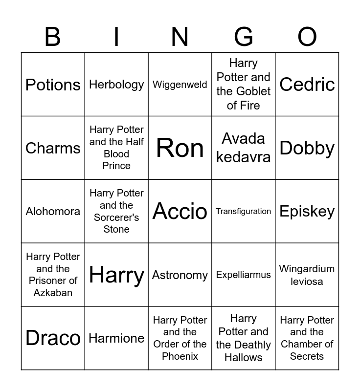 This bingo card has a free space and 24 words: Harry, Harmione, Ron, Draco, Cedric, Potions, Charms, Herbology, Transfiguration, Astronomy, Avada kedavra, Alohomora, Expelliarmus, Wingardium leviosa, Harry Potter and the Half Blood Prince, Harry Potter and the Deathly Hallows, Episkey, Wiggenweld, Dobby, Harry Potter and the Sorcerer's Stone, Harry Potter and the Chamber of Secrets, Harry Potter and the Prisoner of Azkaban, Harry Potter and the Goblet of Fire and Harry Potter and the Order of the Phoenix.