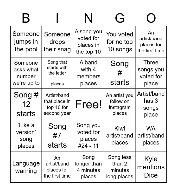 This bingo card has a free space and 37 words: Artist/band with animal in its name places, Song you voted for is #50 - 25, Someone says “this should have been higher”, Song that starts with the letter places, WA artist/band places, Song #7 starts, A band with 4 members places, Song you’ve never heard places, An artist/band places for the first time, A game of beer pong is played to completion, Artist/band that place in top 10 for second year, You voted for no top 10 songs, Kyle mentions Dice, Artist/band has 3 songs place, Someone asks what number we’re up to, ‘Like a version’ song places, Band/artist thanks voters, A song you voted for places in the top 10, Song you voted for places #24 - 11, An artist you follow on Instagram places, Someone jumps in the pool, Three songs you voted for place, Language warning, Song longer than 4 minutes places, Artist older than 50 places, Song less than 2 minutes long places, Someone drops their snag, Song title with four words places, Someone takes a shot of tequila, A game of stack cup is played, A speaker dies, An artist/band places for the first time, Song # 12 starts, Artist/band with colour in its name places, Kiwi artist/band places, Song # starts and Song with the word 'red' in it places.