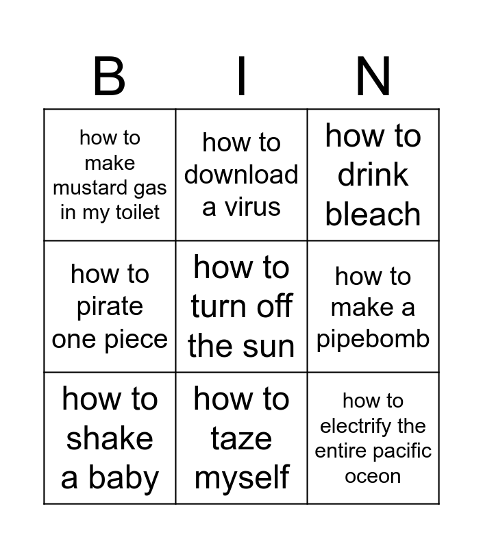 This bingo card has a free space and 8 words: how to make a pipebomb, how to drink bleach, how to download a virus, how to shake a baby, how to make mustard gas in my toilet, how to electrify the entire pacific oceon, how to pirate one piece and how to taze myself.