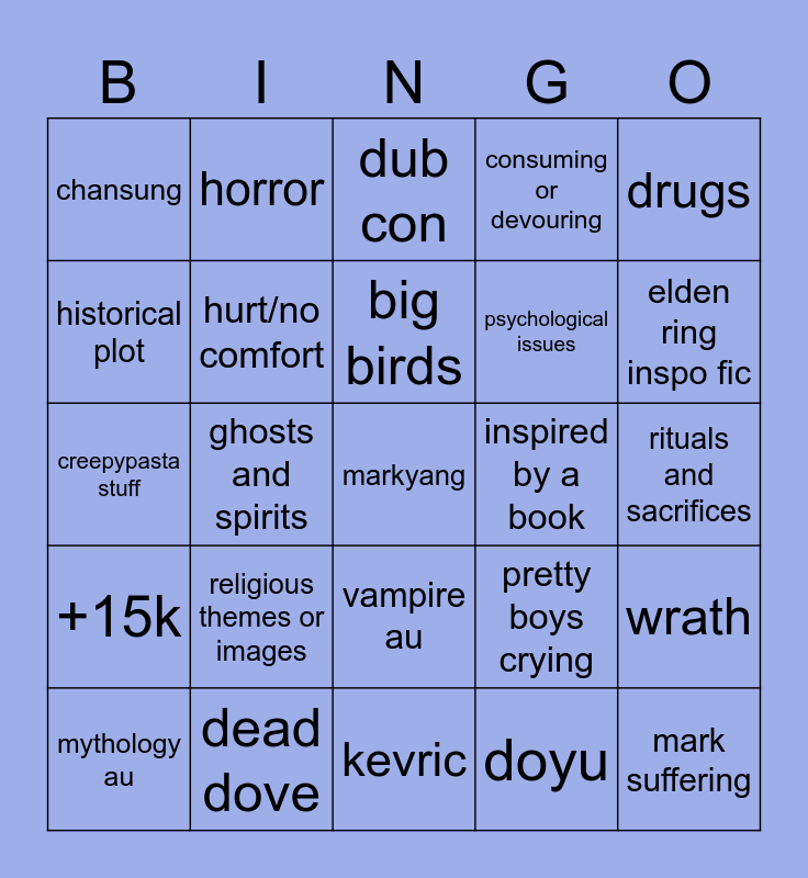 This bingo card has a free space and 24 words: religious themes or images, dead dove, big birds, mythology au, drugs, chansung, historical plot, horror, inspired by a book, vampire au, psychological issues, creepypasta stuff, pretty boys crying, wrath, hurt/no comfort, doyu, rituals and sacrifices, dub con, elden ring inspo fic, ghosts and spirits, mark suffering, +15k, consuming or devouring and kevric.
